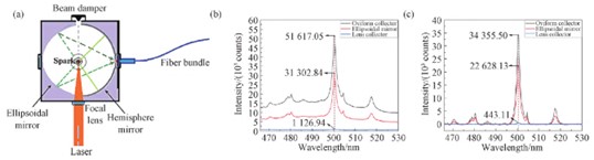 图1. (a)增强型等离子体辐射光谱收集器结构示意图及采用不同光谱收集方法采集到的空气特征光谱,(b)原始光谱,(c)扣除背景后的光谱[2]