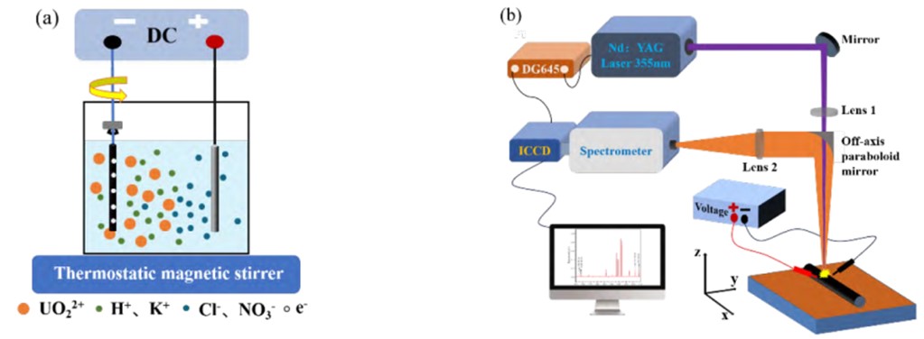 图2.(a)电化学富集装置示意图,(b)LIPS装置结构示意图[10]