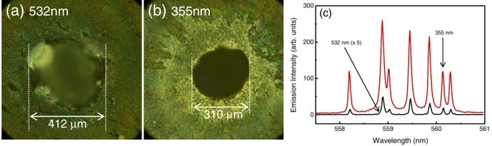 图3.(a)532 nm和(b)355nm波长激光在SRM610玻璃固化体表面的烧蚀坑及(c)特征谱线强度对比