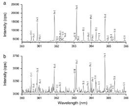 图3. (a)铀矿石压片,(b)铀矿石粉末LIPS光谱