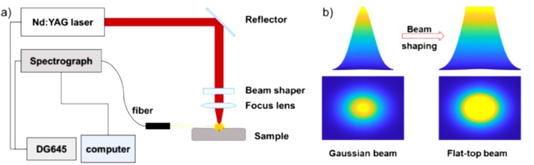 在优化激光等离子体激发条件方面,华中科技大学武汉光电国家研究中心的李青洲等[7]采用激光诱导击穿光谱结合激光诱导荧光(Laser-Induced Breakdown Spectroscopy combined with Laser-Induced Fluorescence, LIBS-LIF)提高铀矿石中的铀特征谱线强度;研究结果表明,与仅采用LIPS技术相比,采用LIBS-LIF技术后U II 409.01 nm特征谱线强度提升21.3倍,铀元素检出限(LoD)由199 ppm下降至35 ppm。清华大学姬建训等[8]通过将入射激光整形为平顶光束,有效改善了激光强度的空间分布,降低了激光与等离子体作用过程中的等离子体屏蔽效应,提高了等离子体辐射光谱强度。实验装置和光束整形如图4所示,研究结果表明,光束整形后,铀矿石中铀元素特征谱线U II 409.013 nm强度提升约5倍,铀元素检出限达到21.2 ppm。中国原子能科学研究院高智星等[9]研发的背负式LIPS装置通过提升激光-等离子体闪光传输效率,将铀矿石中铀元素的检出限降低至18 ppm。激光等离子体激发条件的优化仅需对装置硬件进行简单改进即可有效改善LIPS探测限,无需进行样品前处理,时效性好,适用于铀矿石的原位、现场、快速分析。