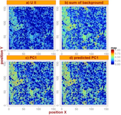 在天然铀矿石中,铀元素并不是均匀分布的。铀元素空间分布特性反应了成矿环境信息,对探索铀矿的形成和演化过程至关重要。在单点检测的基础上,研究人员开始采用LIPS技术对铀矿石中的铀元素分布进行分析。捷克布尔诺理工大学的J. Klus等采用正交双脉冲LIPS对铀矿石中的铀元素进行检测,在此基础上对铀元素的含量分布进行分析,获得了铀元素的二维分布图;如图5所示,铀元素的二维分布的空间分辨率达到100 mm。捷克马萨里克大学M. Hola等[12]将LIPS技术与激光烧蚀电感耦合等离子体质谱(Laser Ablation-Inductively Coupled Plasma Mass Spectrometry, LA-ICP-MS)技术相结合对铀矿石中的铀(U)、铁(Fe)、铅(Pb)、钙(Ca)等多种元素进行综合分析,获得了元素二维空间分布图;其中LIPS被用于元素分布的整体快速成像,可以在20分钟内获取4.023.2 mm范围内,51290个点位的元素分布图像,空间分辨率为80 mm。LIPS技术具有扫描速度快、空间分辨率高的独*优势,但扫描过程受基体效应影响较大,在检测非均匀样品时,样品密度、硬度、元素含量的变化均会对检测结果造成干扰。因此,根据检测对象物理、化学特性的变化对特征谱线强度进行补偿,突破不同基体下铀矿石元素分布的精准定量,将是LIPS技术的研究重点。