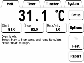 小型加热炉的主要优点是没有过冲。这使您可以将起始温度设置在低于化合物预期熔点的<5°C,其可以快速加热和冷却,并允许仅持续2至3分钟的测定。