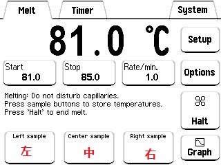 SRS OptiMelt熔点分析仪的用户可以利用肉眼观察图像,并随时点击仪器前面板的左,中,右按钮记录对应样品的个性化记录点。