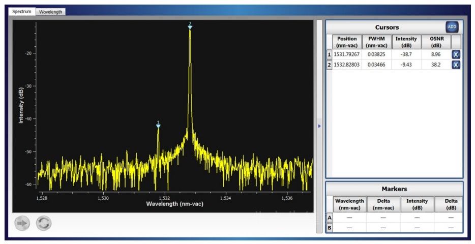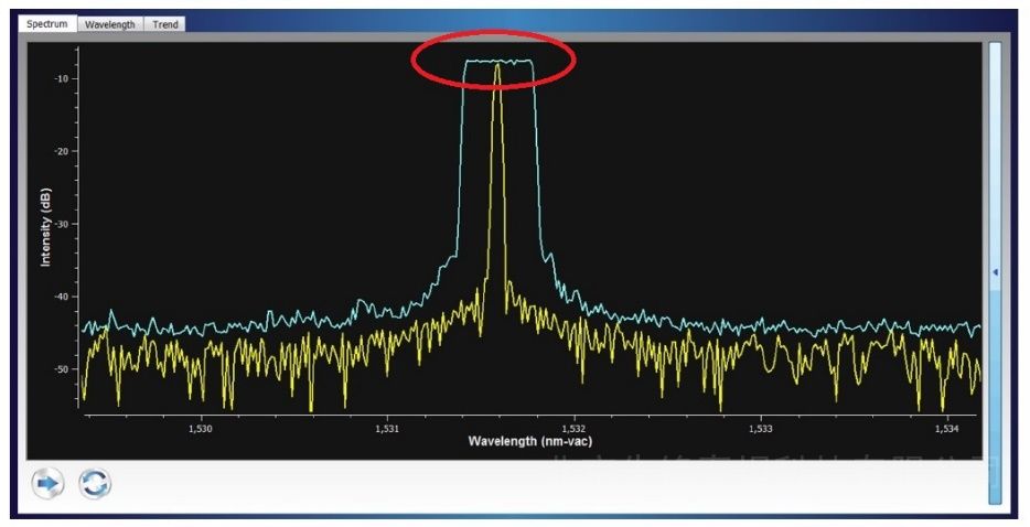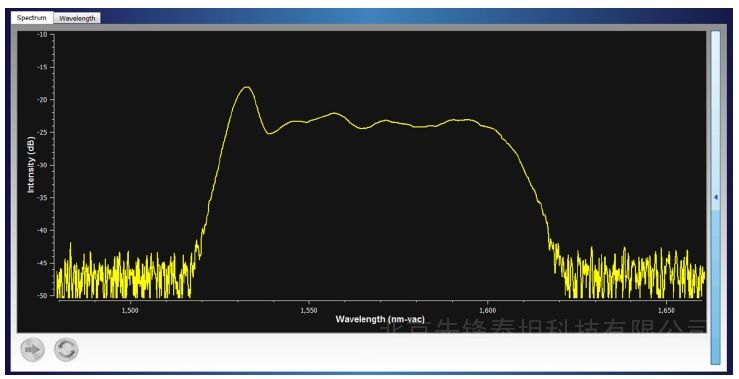 如图五所示,黄色谱线是*近一次采样的激光频谱,蓝色谱线为伴随着波长调谐做多次激光频谱测试的包络线,所以蓝色谱线的上沿平顶部分是分布反馈激光器在调变激光波长后扫描下的激光主模波长调谐的轨迹。无论对于科研用户还是系统整机制造厂家,都是一个直观评价可调谐激光调谐频段的操作界面。