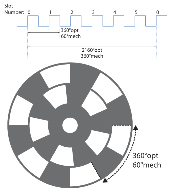 具有 n 个槽的光学斩波轮每机械旋转 360°,将前进 n×360°opt(光学角度)。我们将这些单位指*为光学度数 (°opt) 和机械度数 (°mech)。图 2 显示了 6 槽叶片的区别。