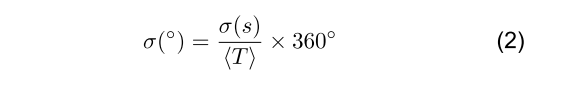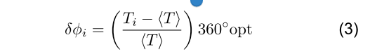 为了评估上述每种效应对斩波器抖动的影响,我们收集了 N 个周期的光信号,并将测量的周期绘制为时间的函数,以及所有测量值的直方图。 我们不是以周期为单位绘制(秒),我们是以光学相位(°opt)为单位进行绘制。每个测量周期 Ti 均转换为相位误差 δψi,如下所示