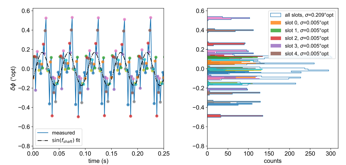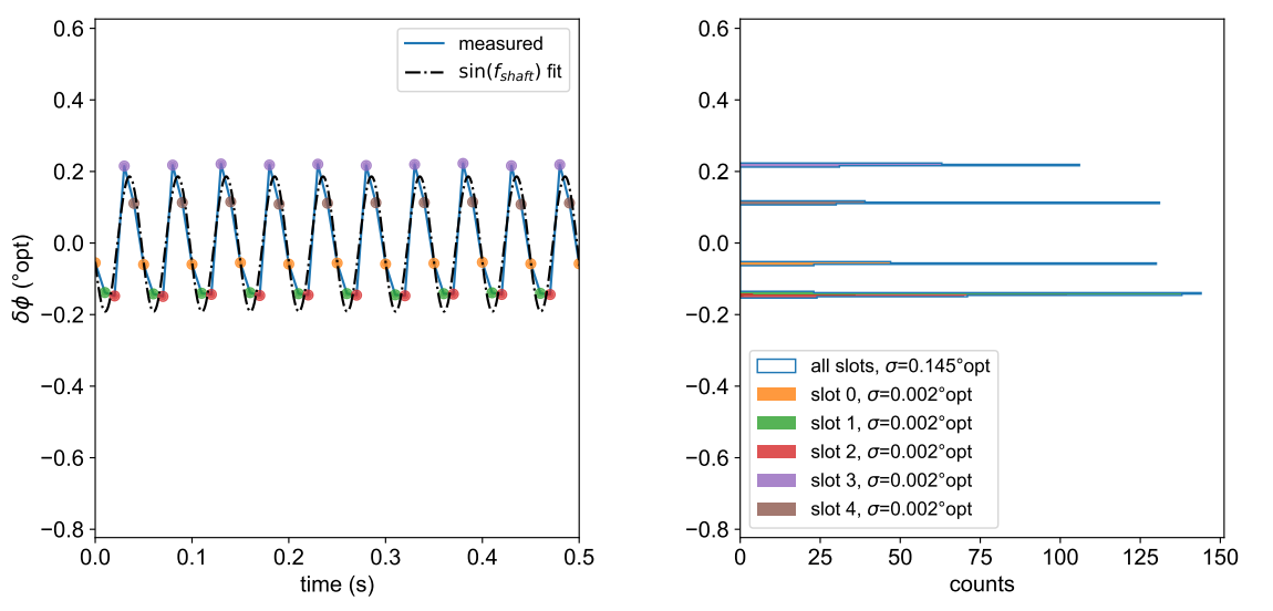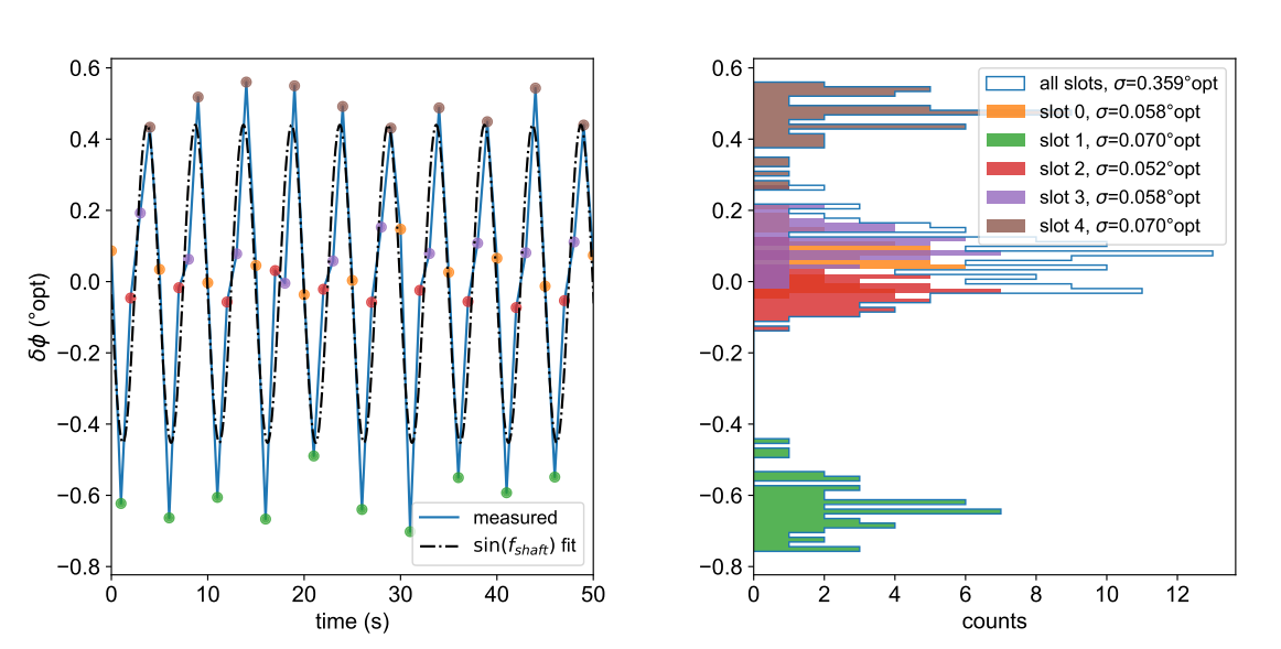 对于 n 槽叶片,每第 n 个周期测量都是对同一槽的重复测量。因此,我们为与该叶片的 5 个槽相对应的周期测量值分配不同的颜色。以槽 1 为例(绿色)。它的平均周期误差约为0.65°opt。这意味着标记槽位 1 周期结束的边缘比预期早 0.65°opt。非确定性抖动将绿色分布的宽度设置为仅为 0.070°opt,因此相位误差从一转到另一转的再现性非常好,并且由确定性误差主导。简单地说,对于单个槽位,相位误差的确定性源确定平均值,而非确定性源确定抖动(标准偏差)。