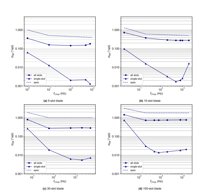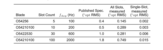 表1中列出了实测性能和已发布规格的表格比较。为简单起见,为每个叶片选择单个斩波频率。显示了“所有槽”和“单槽”抖动值,但由于“所有槽”测量与大多数斩波实验相关,因此应将该值与已发布的规格进行比较。