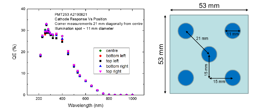 光阴极面积为28.1cm2,较之通常的像管尺,18毫米、25毫米或40毫米直径大得多。我们使用了Photek生产的光度计来评估光阴极响应的均匀性。该光度计使用宽带紫外/可见/红外光源和窄带滤光片,光斑直径为11mm。如图1所示,分别测试5个不同的位置,然后进行对比测试。