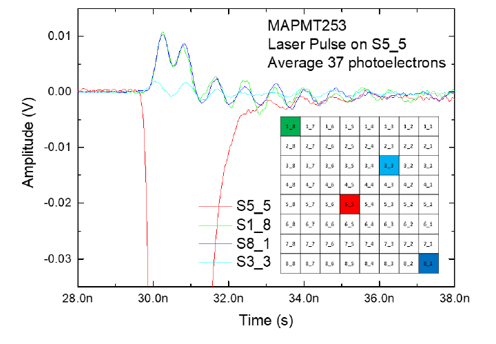 MCP-PMT在非常靠近真空封装(即管壁)的信号接口,经常会受到周边阳极信号的反射影响。我们通过只针对中心S5_5进行多光子脉冲照射,然后分析不同区域的噪声影响。如图5所示: