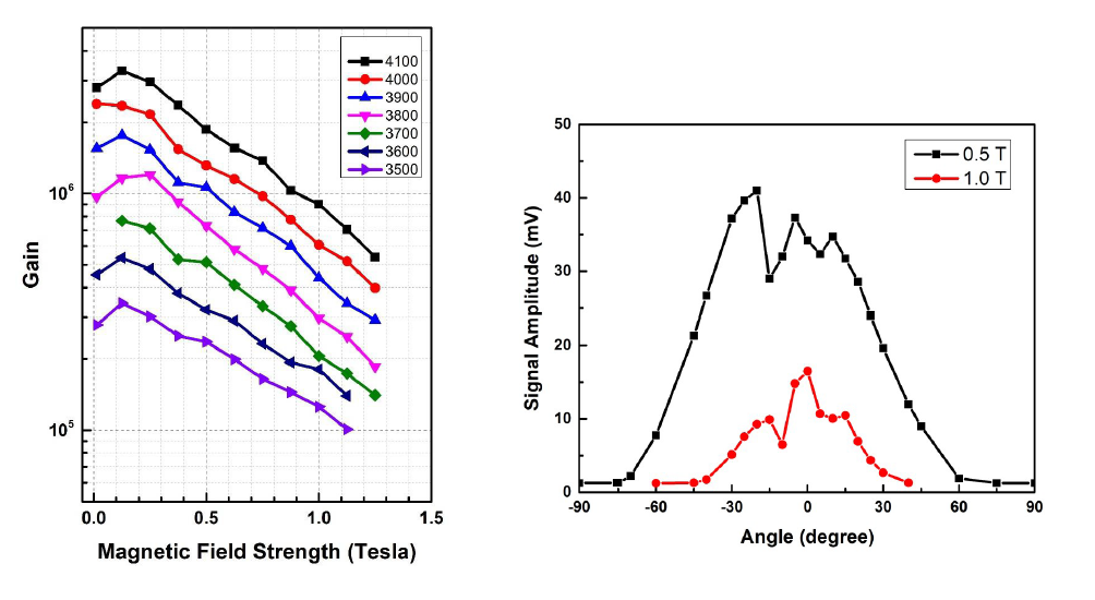 由于此类PMT常在强磁场下工作,而MCP的增益会随着磁场增大而减小,并且孔径越大越容易受到影响。在Argonne实验室,Hattaway等进行了相关的磁场对增益的影响测试。