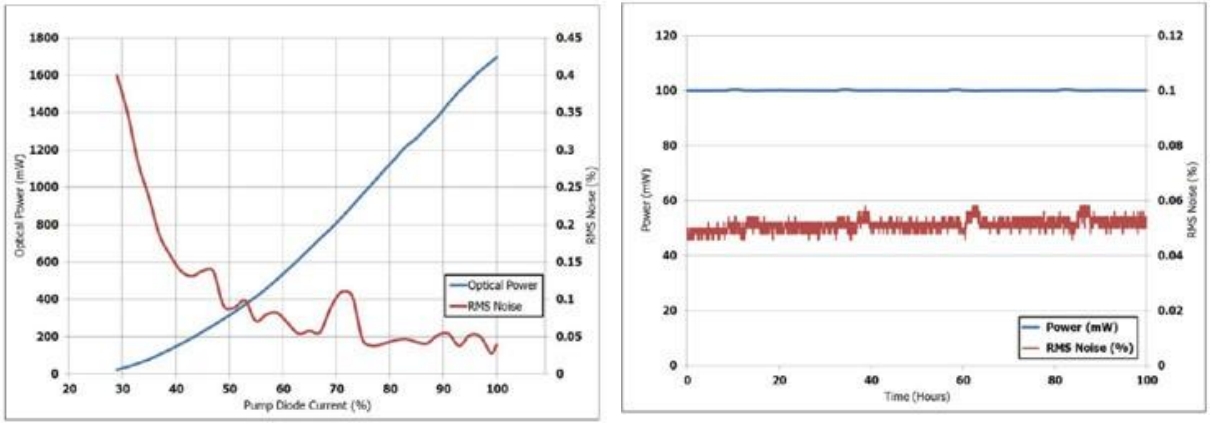 左图 , Ventus 532 蓝线为输出功率 , 红线为 RMS 噪声随二极体泵浦源驱动电流的变化图右图 , Ventus 532 出光 100 个小时后的输出功率 ( 蓝线 ) 及噪声。