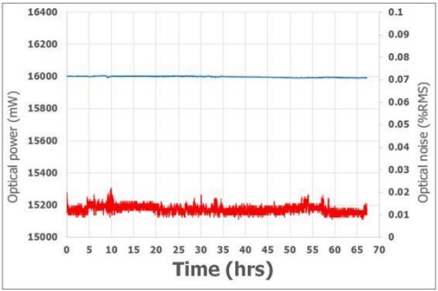 Finesse pure 超过 70 小时的出光测试 ,噪声 ( 红线 )~0.01%, 功率稳定度 ( 蓝线 )<0.05%。