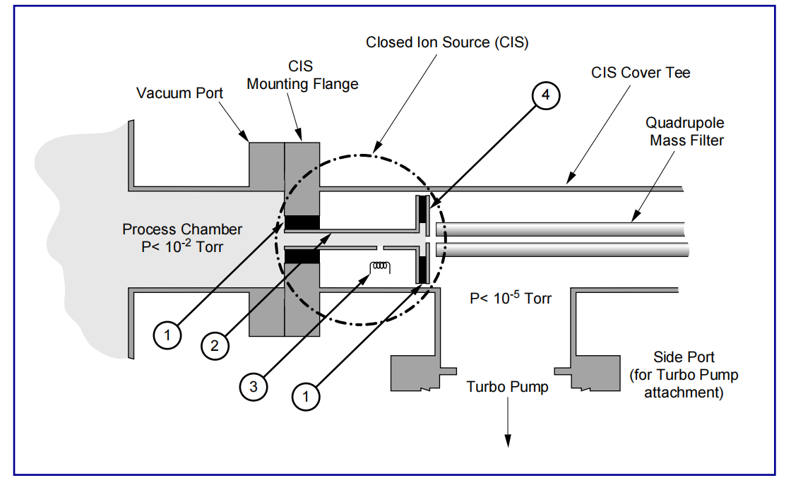 在需要测量 10 4 和 10 2 Torr 之间的压力的应用中,通过用封闭离子源(CIS)采样系统取代传统的 OIS PPR 配置,可以显著减少背景和工艺气体干扰的问题。一个通用的 CIS 设置的横截面如图 3 所示。
