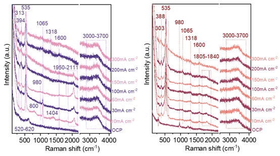 图3. 电化学原位拉曼光谱测试在两种不同条件下的测试结果,测试可在低电流到高电流条件下进行,*高电流密度可达300 mA cm-2, 满足大多数流动型测试系统的要求。注:其他测试条件不宜公开。