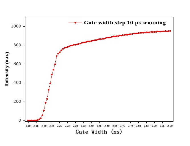 IsCMOS具有超快光学门宽,<3ns阴极光学门宽,内置精度<10ps门宽控制器。下图为门宽递进10ps扫描纳秒光源图谱。
