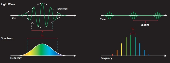 就光频梳的科普文章,小编不敢班门弄斧,建议大家参考一篇科普文章,Dr. Steven Cundiff, Jun Ye and John Hall 发表在Scientific American的 "Ruler of the light" . 在这里,就不引用其文字,而主要引用其文章内几张很有代表性的图片。