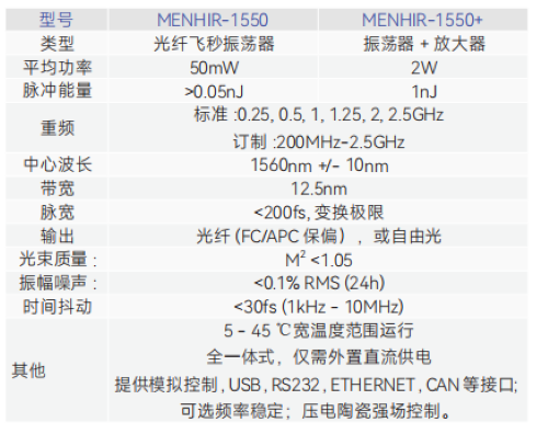无论是实验室自搭,建还是高科技公司商品化的基于锁模飞秒激光器的光频梳,其飞秒激光器部分都是整个光梳系统内硬件成本占比*高的部分。其中瑞士Menhir公司的GHz重复频率的光纤飞秒激光器在搭建GHz大梳齿间隔的光频梳应用上为广大科研以及OEM用户所接受与推崇。其常用产品分为250MHz,1GHz,2.5GHz三种重复频率的型号,波长在1545-1565nm,脉冲宽度250fs; 重复频率越高价格越高。