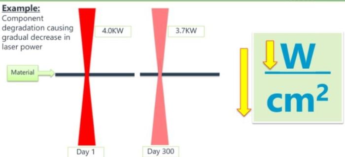 1. 随着使用时间的增加,实际切割或者焊接的时候会发现质量变差,*直接的体现就是在同样激光参数设置下,样品不能被切割开或者焊接变差出现虚焊等现象,这个是由于激光功率变化造成的,功率下降后*终在样品工作点位置功率密度下降造成的,此时需要调节激光参数从而达到*初设置;