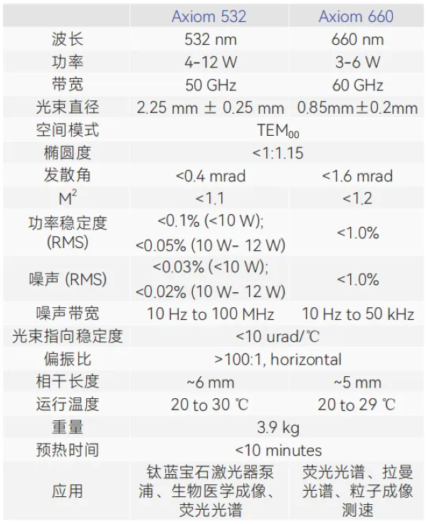 Axiom 为 Laser Quantum *新推出的高功率连续激光器 , 特点在于把半导体泵浦源整合在激光器内 , 激光头无须外接光纤连接控制箱 , 使得更容易把激光头整合在实验装置内 , 尤其适合用在钛蓝石激光器作泵浦源等。此外,Axiom 系列有高功率的红光输出 , 660nm 的输出功率高达 6W。