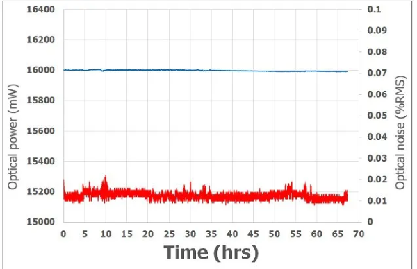 Finesse pure 超过 70 小时的出光测试 ,噪声 ( 红线 )~0.01%, 功率稳定度 ( 蓝线 )<0.05%;