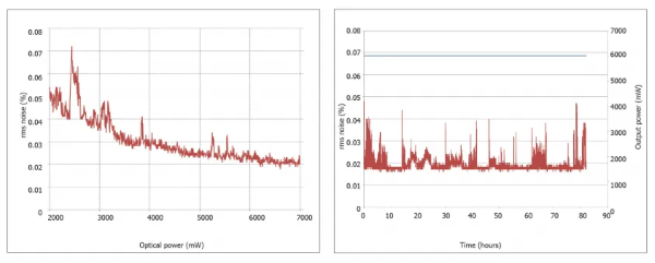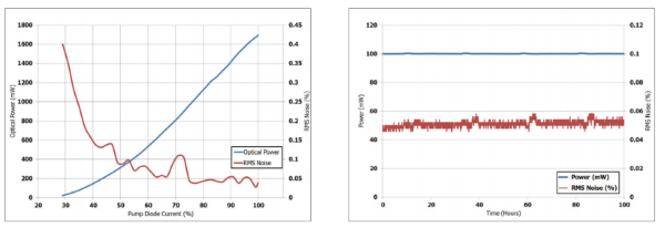 左图 , Ventus 532 蓝线为输出功率 , 红线为 RMS 噪声随二极体泵浦源驱动电流的变化图右图 , Ventus 532 出光 100 个小时后的输出功率 ( 蓝线 )及噪声 ~0.06%( 红线 ) 变化图