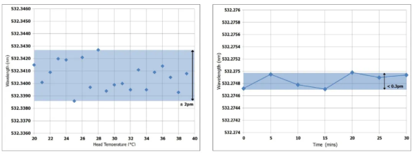左图 , Torus 532 的波长稳定度随环境温度的变化图;右图 , Torus 532 的波长稳定度随工作时间的变化图