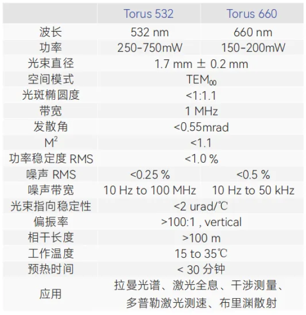 Torus 系列单纵模激光器有 532nm 和 660nm 两个波长 ,是市场上唯一的主动锁模的商业化低噪声单纵模激光器,线宽低于 1MHz, 其独有的主动锁模技术持续跟踪纵模位置并通过修正腔长使得纵模波长维持在 5pm 之内 , 在工作温度范围内消除了跳模。Torus 系列激光器乃全息、布里渊散射及高分辨率拉曼光谱的理想之选。