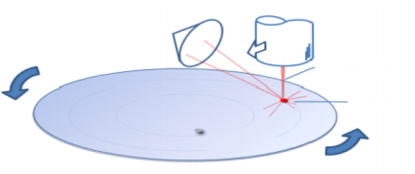 如图一.激光光束经过聚焦镜以一定的倾斜角照射到晶圆表面,大部分激光会发生镜面反射然后被人工放置的激光吸收器(damper)吸收,小部分会被晶圆表面吸收,极小部分会向各个方向散射。我们在垂直的方向放置一个探测器检测散射光的强度,通过晶圆的高速旋转叠加径扫描实现对于晶圆上所有点的检测。正常状态下探测器检测到的是微弱的散射本底,向而当激光光束扫描照射到晶圆上的瑕疵时,由于瑕疵点的微区散射率会小幅度直至大幅度的增加,探测器输出的信号强度也会等比的变化,以此我们实现了晶圆上瑕疵点的扫描检测。