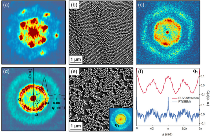 图2、不同对称性二氧化硅纳米球晶格的相干极紫外散射。(a, d) 不同样品区域的极紫外布拉格衍射图,(b, e) 用极紫外布拉格相干衍射探测的样品扫描电子显微镜图像。(c 和 e 的插图) 分别为 (b) 和 (e) 的傅里叶变换的平方振幅所得到的模拟结果。(f) 比较了 (d) 样品的极紫外相干衍射图和 (e 的插图) 扫描电子显微镜图像区域的模拟结果之间的互相关函数。两条曲线的四重周期性表明,在确定该样品区域的晶格对称性方面,两者具有定性一致性。[OPTICS EXPRESS, Vol. 26, No. 9,11399(2018)]