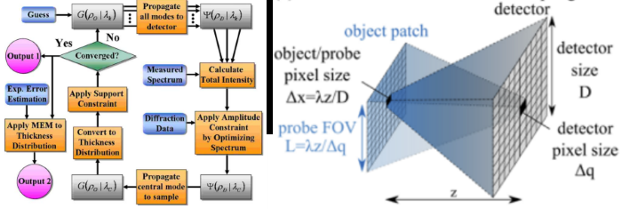 图1、左:多波长CDI的算法工作流程[Physical Review A 79, 023809(2009)]。右:ptychography中的采样要求,像素大小 x和视场L,假设弗劳恩霍夫或菲涅耳衍射[Optics Express, Vol. 30, No. 3, 4133(2022)]。