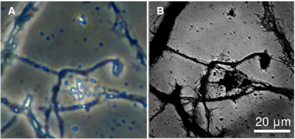 图3、光学图像与极紫外(EUV)图像的比较。图中显示了培养7天的神经元样本:(A)固定后样本的白光相衬显微镜图像;(B)固定后样本的叠层衍射成像(ptychography)29 nm(43 eV)极紫外(EUV)强度透射图像。极紫外成像提供的额外细节和分辨率从较粗束周围精细结构的可见性中可以立即看出[Sci. Adv. 2020; 6 : eaaz3025 1 May 2020]。