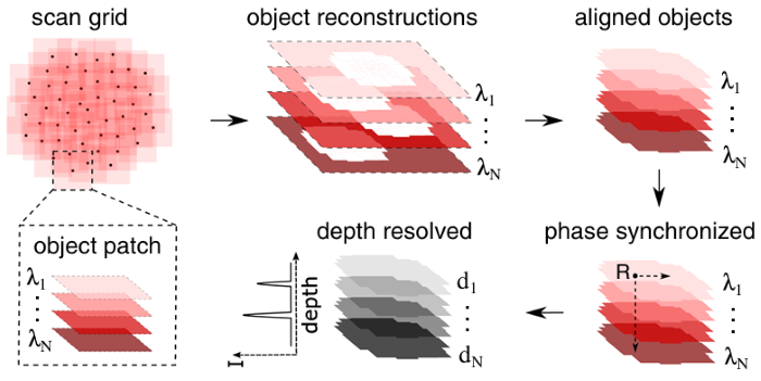 图4、POCT重建流程。首先对每个波长进行单层ptychographic重建,然后通过缩放和配准对所有重建图像进行对齐,并使用合成参考信号进行相位同步。*后,通过傅里叶变换揭示深度分布[Optics Letters, Vol. 46, No. 6, 1337 (2021)]。