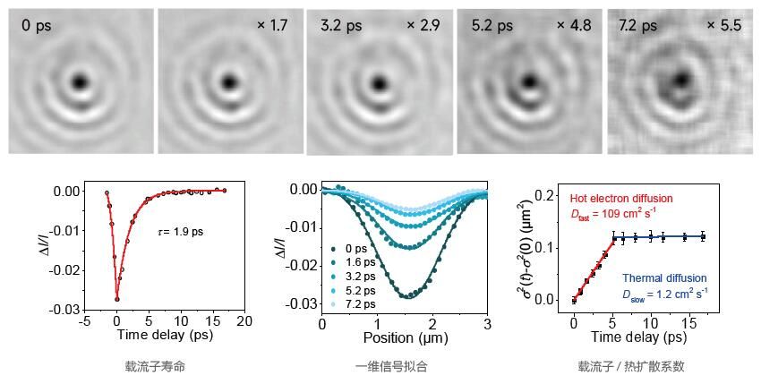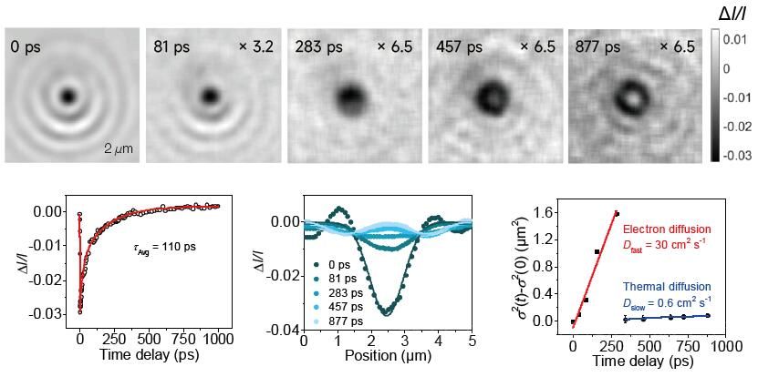 10 nm厚金属薄膜上的超快热载流子和热扩散,采用仪器的点激发,宽场探测模式。