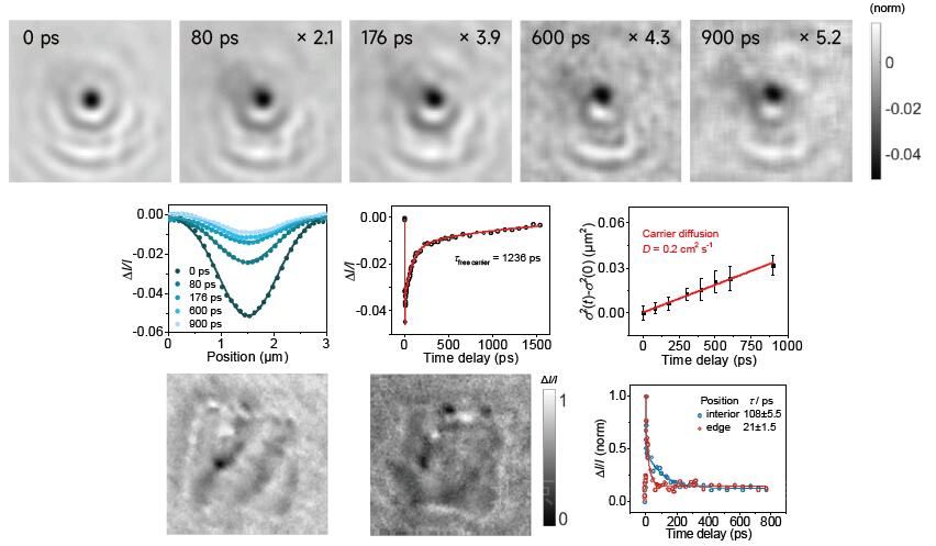 钙钛矿CsPbBr3载流子成像,迁移动力学及边缘态动力学研究。采用仪器的宽场激发,宽场探测模式