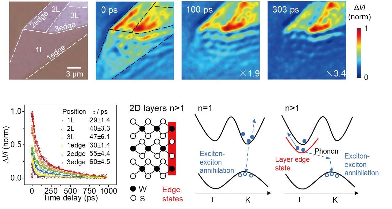 二维WS2中激子分布情况,激子寿命研究。可以看到,多层的边缘具有更高激子密度和更长激子寿命