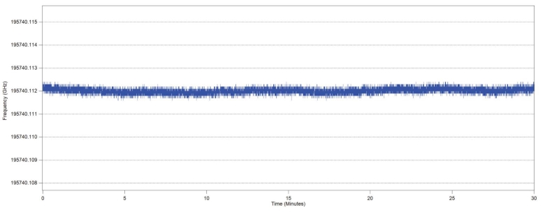872A-NIR监测1532nm乙炔锁频激光器在30分钟内的中心波长漂移测量结果(标准差为191 kHz)。
