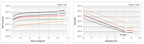 图2, 暗电流Vs 偏置电压 图3, 分流电阻 Vs 温度
